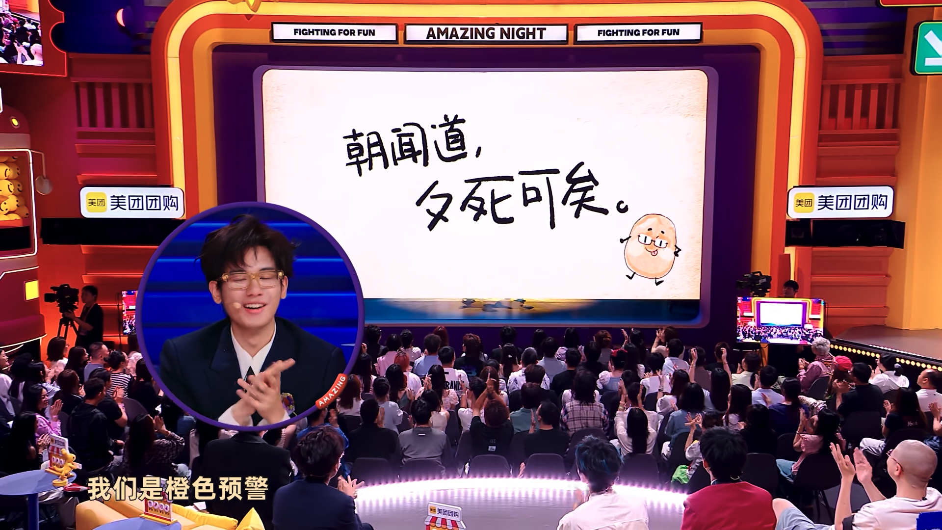 《吐槽吧!吕小严》展演结束后,幕布升起,上书《论语》中的一句话:朝闻道,夕死可矣。